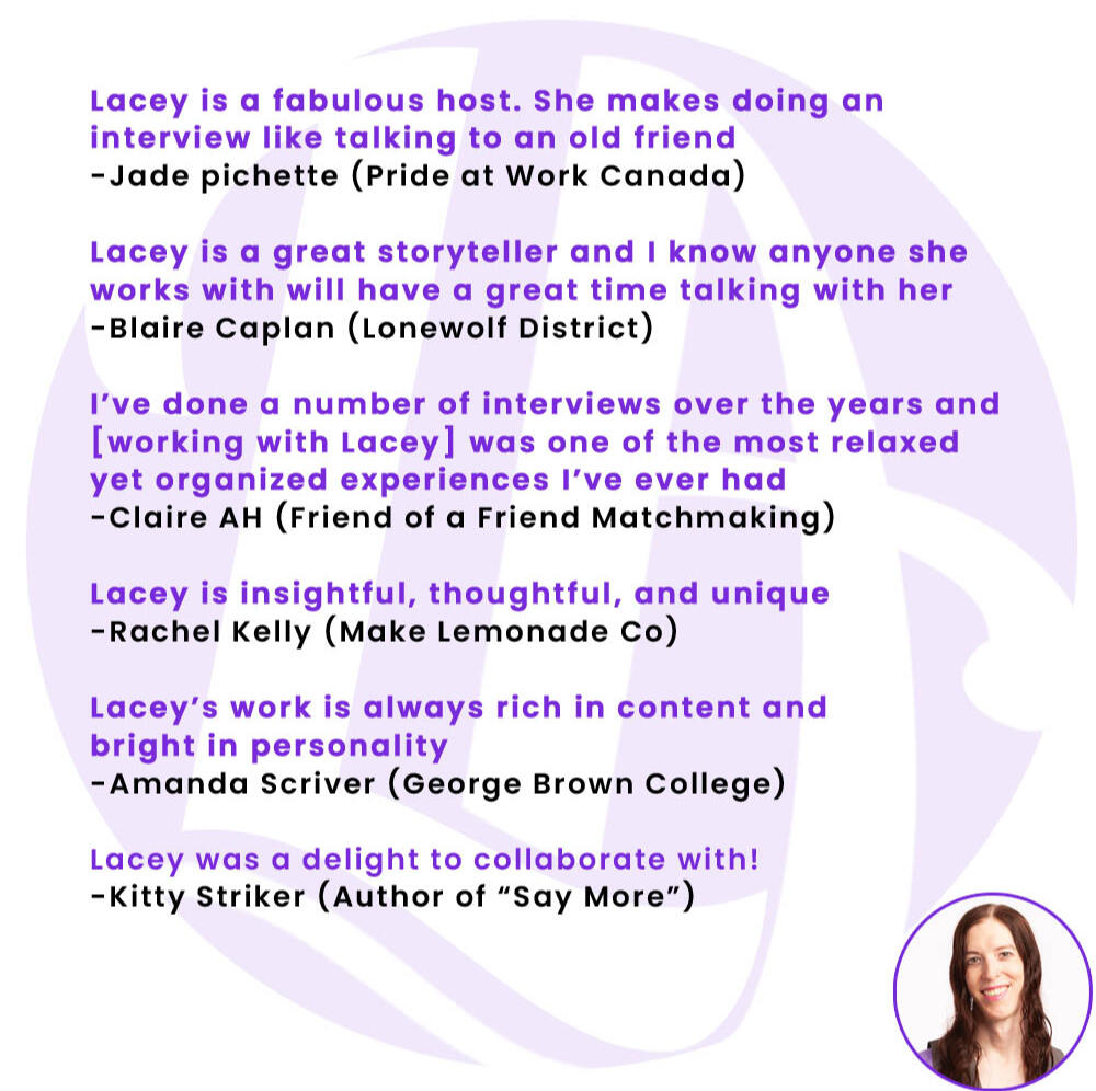 Lacey (she/they) is a speaker, consultant, educator, and creative producer. She was late-diagnosed Autistic/ADHD, and has blossomed into a driven and dynamic person.Lacey discovered her passion for public speaking in 2013 when she started her first podcast.She has the unique distinction of being an accountant turned public speaker, thanks in part to improv and standup comedy classes.Throughout her adult life, Lacey was always searching for a job that allowed her to 'bring her whole self to work every day', after 15 years in the corporate world failing to achieve this, she started her own company and realized her goal.She delivers strong results across mediums, from private consulting and coaching to keynote speeches, to playful workshops and creative media production.Lacey has been producing media in one form or another since high school. She is a published author, independent music producer, indie filmmaker, graphic designer, puppeteer, comedian, and more.Lacey is nicknamed The Purple Blur by friends, because of how much purple attire she owns, and how busy she keeps herself. Lacey is also a member of the 2SLGBTQIA+ community.